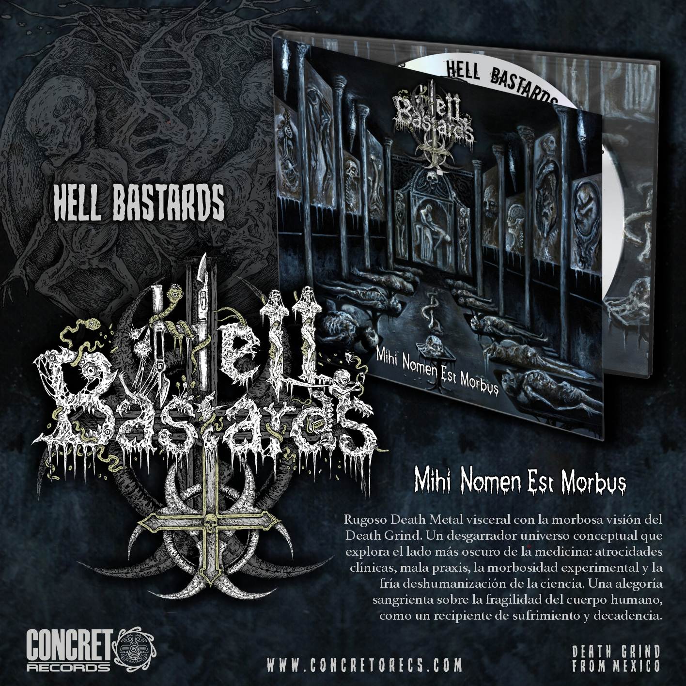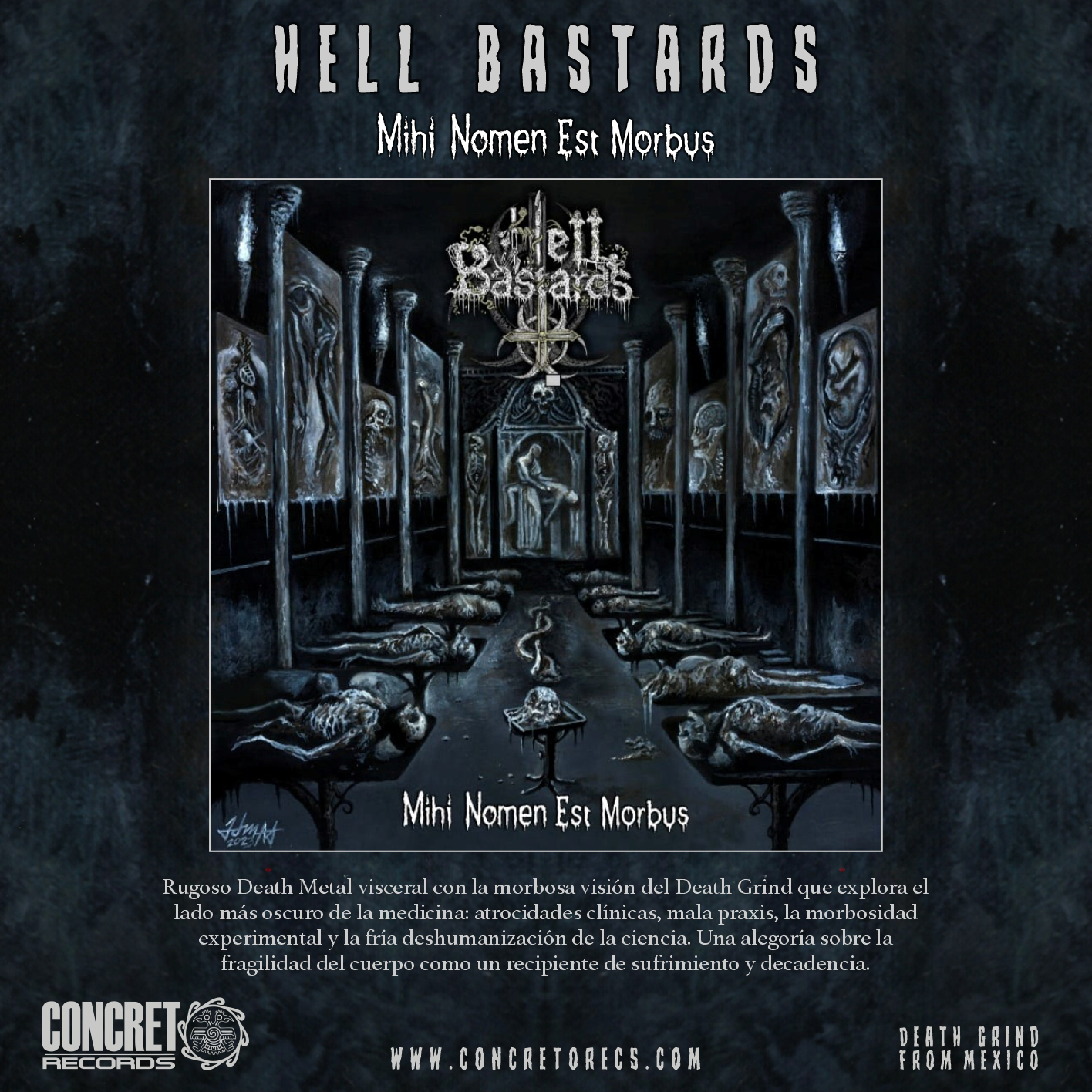 Rugoso Death Metal visceral con la morbosa visión del Death Grind. Un desgarrador universo conceptual que explora el lado más oscuro de la medicina: atrocidades clínicas, mala praxis, la morbosidad experimental y la fría deshumanización de la ciencia. Una alegoría sangrienta sobre la fragilidad del cuerpo humano, como un recipiente de sufrimiento y decadencia.